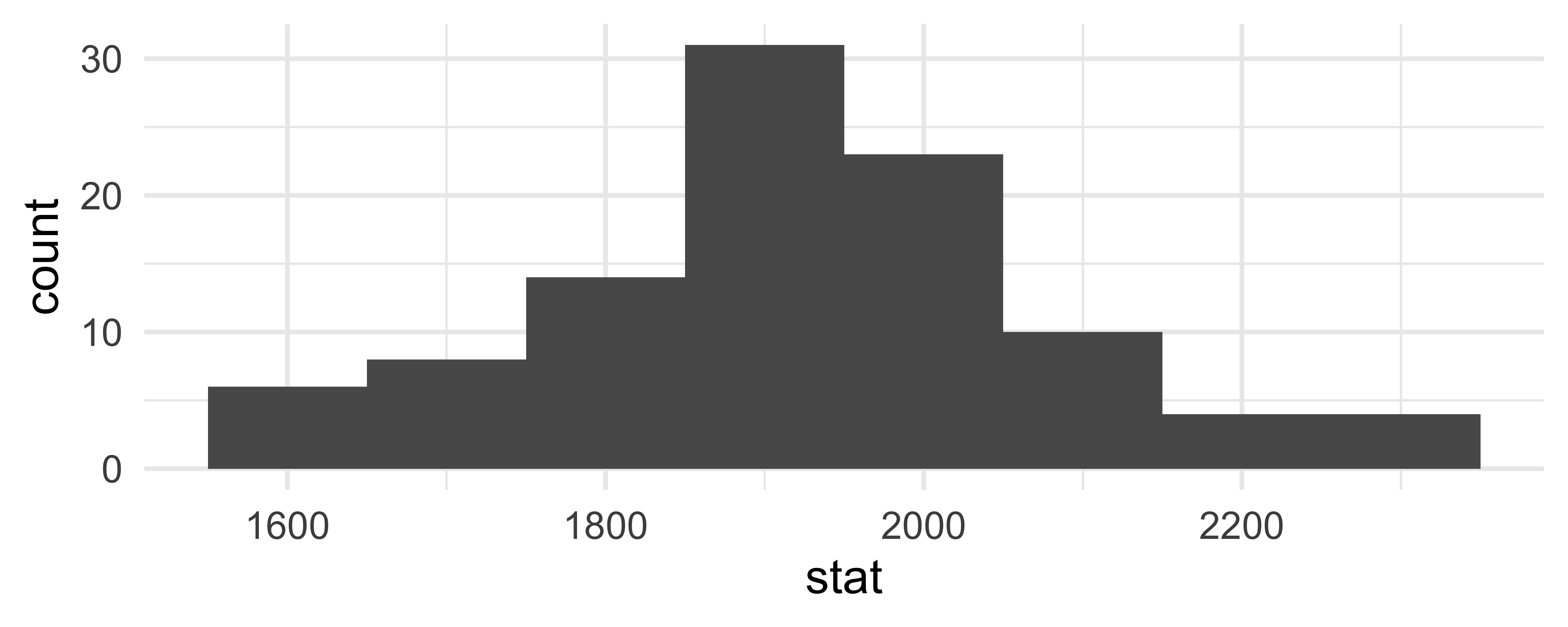 ## # A tibble: 15,000 x 2## replicate stat## <int> <dbl>## 1 1 1793.## 2 2 1938.## 3 3 2175 ## 4 4 2159.## 5 5 2084 ## 6 6 1761 ## 7 7 1787.## 8 8 1817.## 9 9 1963.## 10 10 1800.## # … with 14,990 more rows