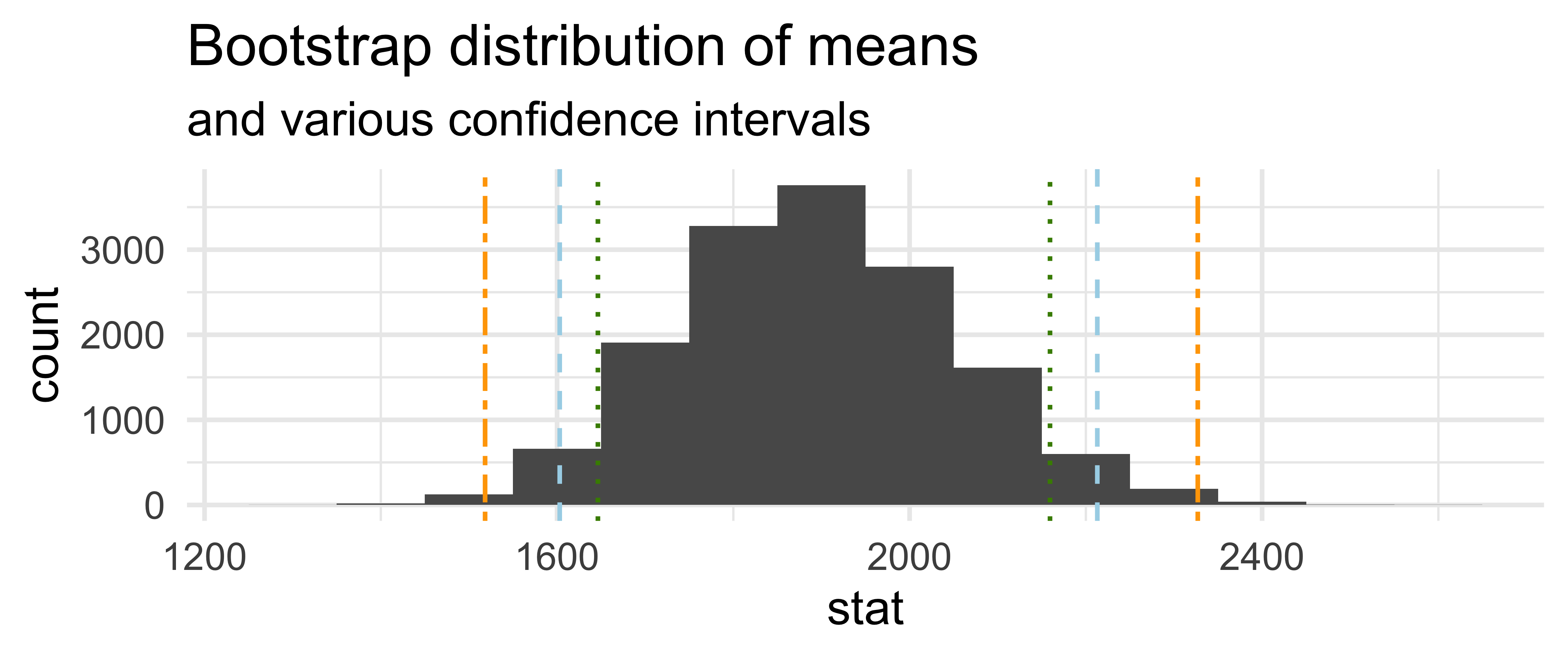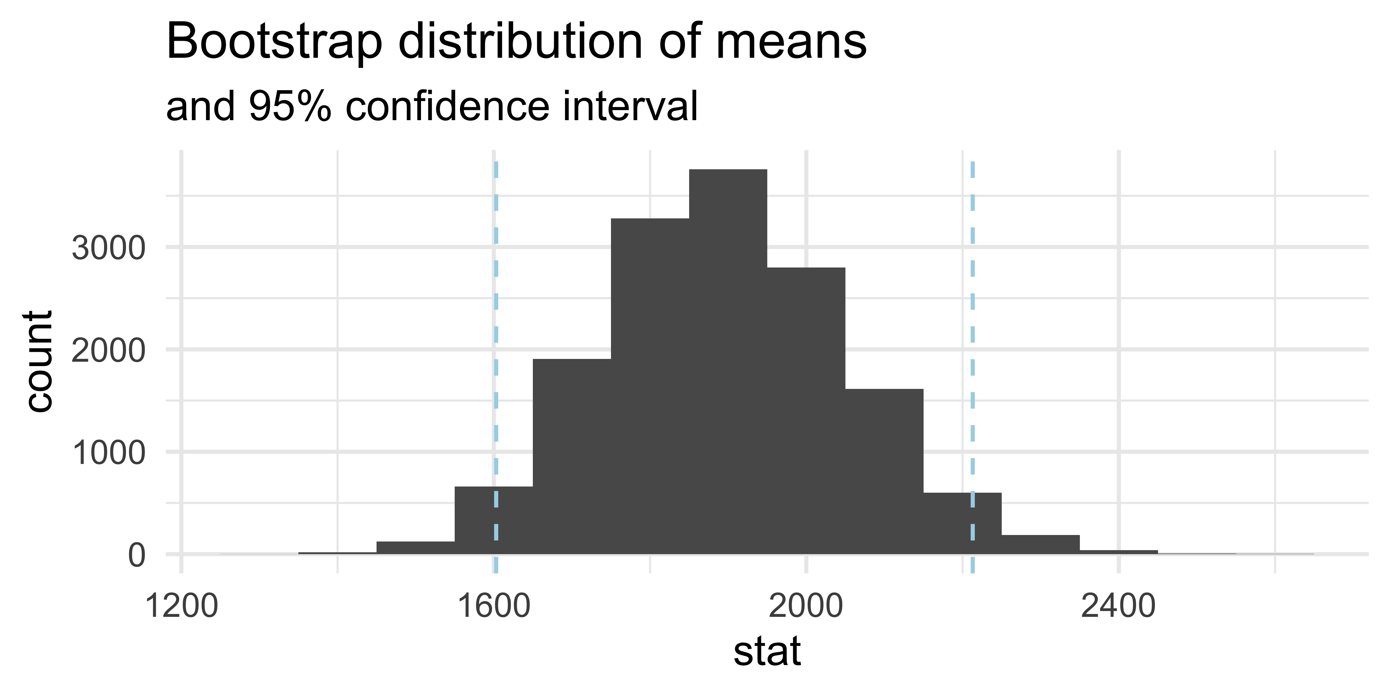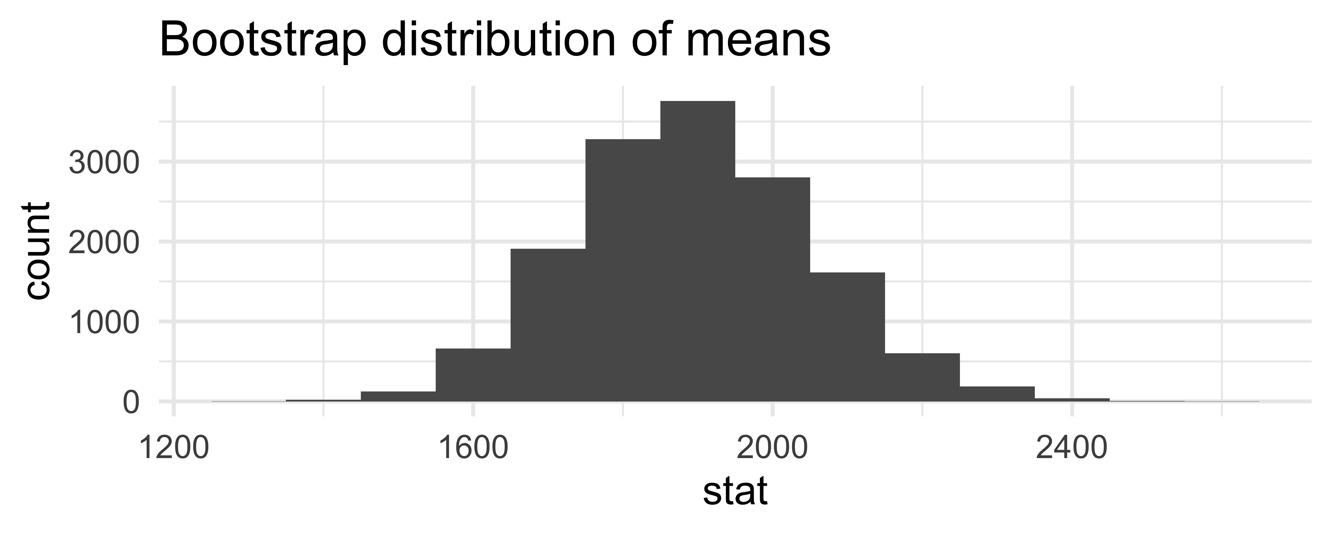 # save resulting bootstrap distributionboot_df <- edi_3br %>% # specify the variable of interest specify(response = rent) %>% # generate 15000 bootstrap samples generate(reps = 15000, type = "bootstrap") %>% # calculate the mean of each bootstrap sample calculate(stat = "mean")